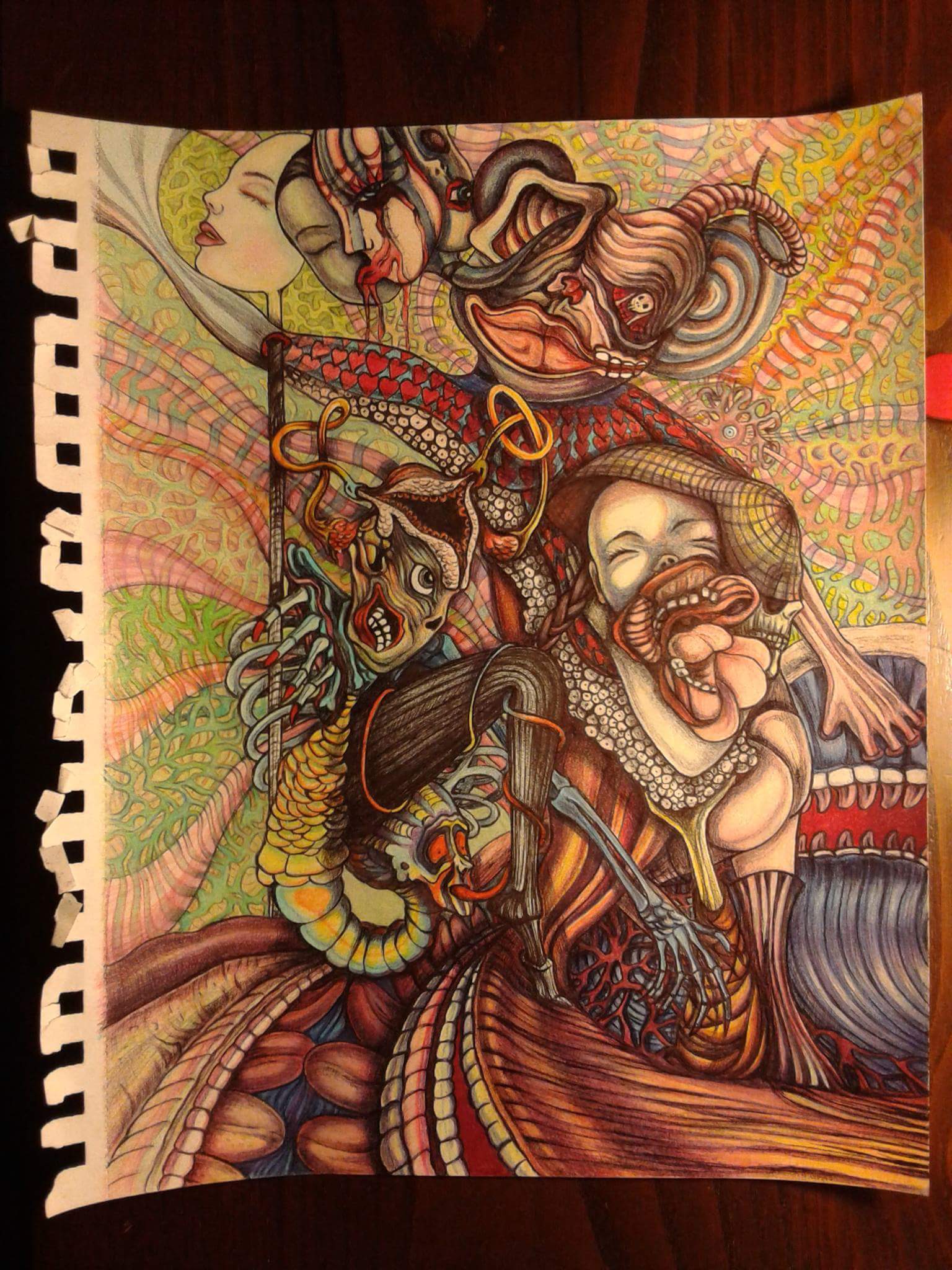1. Le impazienze. Un muro di oggetti ramificati che intrecciano ghirlande di morte e di cellule emerse dalle tenebre di due occhi-vitelli questo è di norma il foglio di carta sul quale lavora Ale da almeno un anno. Uno guarda fuori campo e del ritratto stile tardo seicentesco che ha catturato l’attenzione iniziale, vede gli arti posteriori, teschi, volti umani invecchiati, un addome o parte del torace – come se il ritratto fosse diventato quello che già è: una serie di cellule di carne simili a virus o ad animali primitivi degli abissi oceanici più profondi. La quantità di viscere esplose sollecita sensazioni che ci restituiscono l’idea dell’impazienza. Quel viso di donna circondato da esseri mostruosi e strati di cellule dai nuclei lussureggianti, pare impaziente di uscire dalla condizione di non-vita in cui è stato relegato, di liberare la gioia strozzata nei suoi nervi, nei suoi tendini e nei suoi muscoli; la gioia che si esprime senza parole o che le parole non possono esprimere. La vorticosa impennata di tutte queste forme di vita sono l’impazienza di un testimone autentico della fine del mondo che ha registrato ogni cosa per trasformarlo in simulacro di testimonianza. Il fine è quello nervoso di vivere ora il suo implacabile destino. La necessità di questa penna a sfera (impaziente anche se in realtà lenta, accurata, minuziosa anzi proprio bizantina) è quella di rendere intellegibile ai più il segreto impronunciabile del reale.
