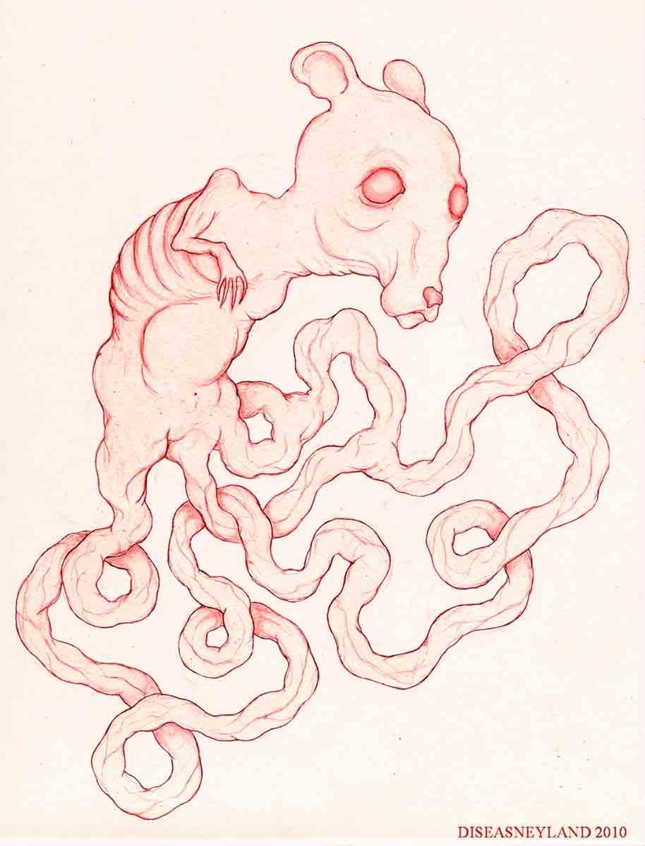 2. Le rabbie. Esseri monocellulari dalle forme animalesche che richiamano alla memoria specie preistoriche o entità marziali che abitano i nostri intestini, quelli disegnati in questi fogli parlano di collera e rabbia. La collera che rende irascibili, pronti a stravolgere l’ordine simbolico del canone naturalista, la rabbia che abbina volti umani a dissezioni e prevede che batteri, virus e gli animali che ci portiamo addosso siano raffigurati come metafore (sia dell’umano che della specie). Collere che parlano della condizione di miliardi di altri corpi che hanno subito, stanno subendo e subiranno la sorte di cadere, spezzarsi, moltiplicarsi o ridursi vertiginosamente, stravolgendo le giuste quantità, la giusta metà o la ragionevole forma delle cose. La forma delle cose che vivono con serenità. Questa è collera e rabbia di chi non smette di chiedersi: come è possibile che non si riesca a vedere quella massa di mostruosità che è un corpo.
