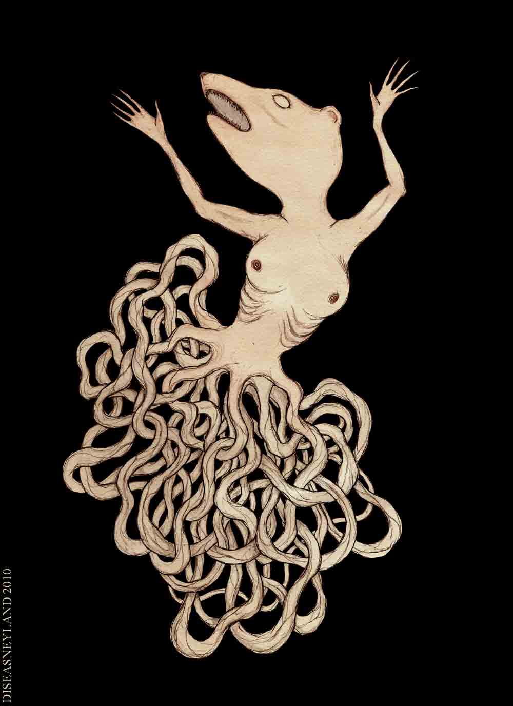 Immagini surreali di corpi deformati dal peccato punk, elaborazioni certosine di pennarello su carta e trasposizione elettronica in un miscuglio altamente provocatorio. Si potrebbe parlare di una sintonia di vedute dell’Industrial con il punk e con parte del Pop surrealism, con uno spirito a metà strada tra il ribelle e il necessariamente oltraggioso, ma con una cura del dettaglio difficilmente classificabile all’interno del panorama illustrativo.