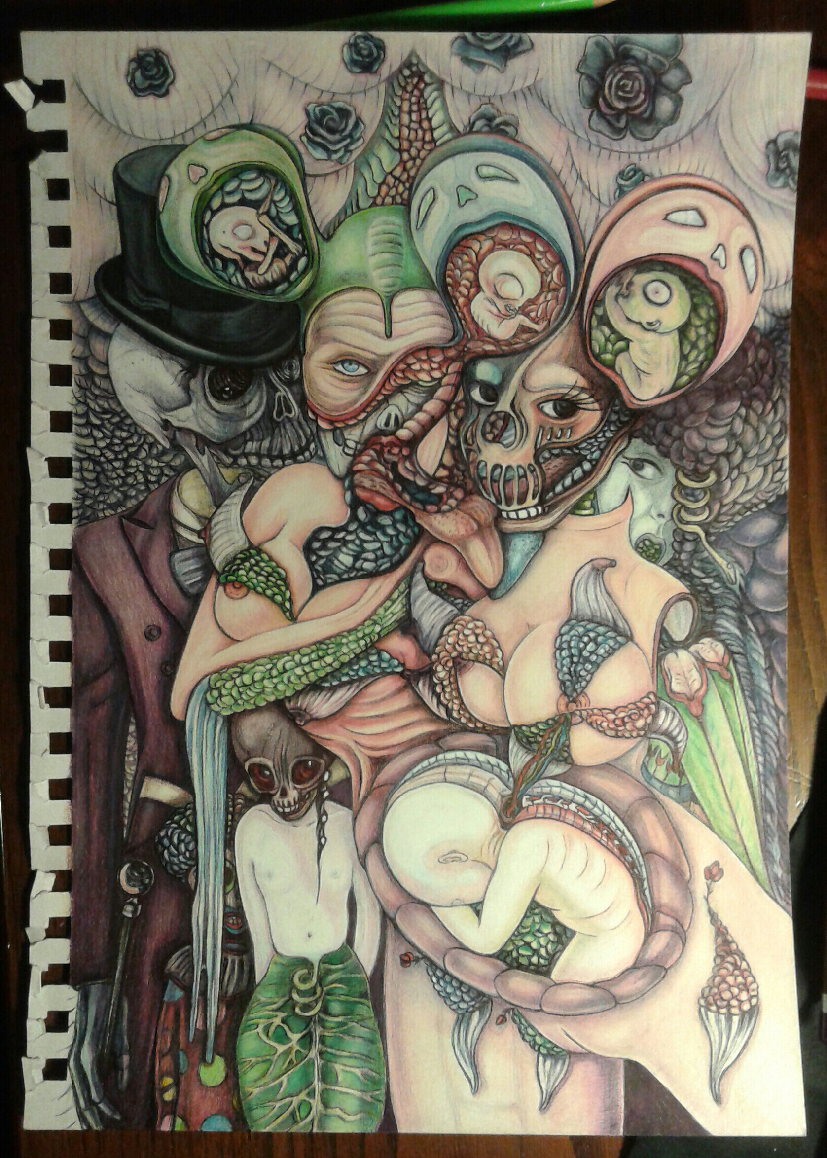 1. Le impazienze. Un muro di oggetti ramificati che intrecciano ghirlande di morte e di cellule emerse dalle tenebre di due occhi-vitelli questo è di norma il foglio di carta sul quale lavora Ale da almeno un anno. Uno guarda fuori campo e del ritratto stile tardo seicentesco che ha catturato l’attenzione iniziale, vede gli arti posteriori, teschi, volti umani invecchiati, un addome o parte del torace – come se il ritratto fosse diventato quello che già è: una serie di cellule di carne simili a virus o ad animali primitivi degli abissi oceanici più profondi. La quantità di viscere esplose sollecita sensazioni che ci restituiscono l’idea dell’impazienza. Quel viso di donna circondato da esseri mostruosi e strati di cellule dai nuclei lussureggianti, pare impaziente di uscire dalla condizione di non-vita in cui è stato relegato, di liberare la gioia strozzata nei suoi nervi, nei suoi tendini e nei suoi muscoli; la gioia che si esprime senza parole o che le parole non possono esprimere. La vorticosa impennata di tutte queste forme di vita sono l’impazienza di un testimone autentico della fine del mondo che ha registrato ogni cosa per trasformarlo in simulacro di testimonianza. Il fine è quello nervoso di vivere ora il suo implacabile destino. La necessità di questa penna a sfera (impaziente anche se in realtà lenta, accurata, minuziosa anzi proprio bizantina) è quella di rendere intellegibile ai più il segreto impronunciabile del reale.