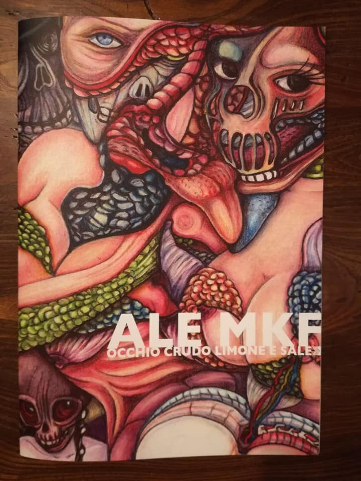 Quello tracciato dalla penna bic è un linguaggio obbligatorio e rituale. È il linguaggio capace di rendere evidente l’orrore più cupo – le guerre interne contro il male di vivere, ma anche e in egual misura, la generalizzata messa a morte di corpi disegnati a frammenti. Frammenti di membra che si mostrano regolarmente nei sogni…Allora quel ritratto centrale che cattura l’attenzione lascia ben presto spazio a ciò che lo circonda e in quel momento l’occhio si accorge della forma di membra disgiunte o delle ataviche figure animalesche oppure delle cellule degli organi del corpo umano che mettono ali e si armano per le persecuzioni intestine. Il bianco e nero che ne consegue è frutto di lentissimi passaggi chiaroscurali in grado di descrivere un mondo al microscopio con un linguaggio che sembra legittimare la malvagità del banale. Il lavorio dei dispositivi medici di scansione delle cellule e la visione microscopica, dietro una scintillante patina di naturalità, continua a trasformare il vivo in morto. È proprio da questo linguaggio che prendono forma le immagini di Ale MKF a formare una vera e propria smaterializzazione di corpi non umani e che ci parla dell’insensatezza del vivere. Tanto debordante da farla diventare insostenibile e indicibile. La penna bic prova l’impatto letale delle minuscole turbolenze della vita e si presta ad allestire un vero e proprio esperimento gestaltico che ci fa vedere dei volti là dove pensavamo di percepire cose, e animali laddove credevamo di vedere ossa fegati o polmoni. Immagini che ci chiedono di assumere la giusta prospettiva per scorgere la morte dove essa ha trasformato chi vive in un semplice trasportatore di equipaggiamenti. L’opera costituisce la volontà di narrare un senso e quindi, di tessere le fila di un racconto sulla vita e per Ale significa insistere nella determinazione di significati. Produrre dosi maggiori di senso e significato, allo scopo di stimolare temi di ricerca da descrivere, spiegare o prevedere. Occhio crudo è dunque per lei l’accumulazione grottesca di corpi che non hanno spazio.